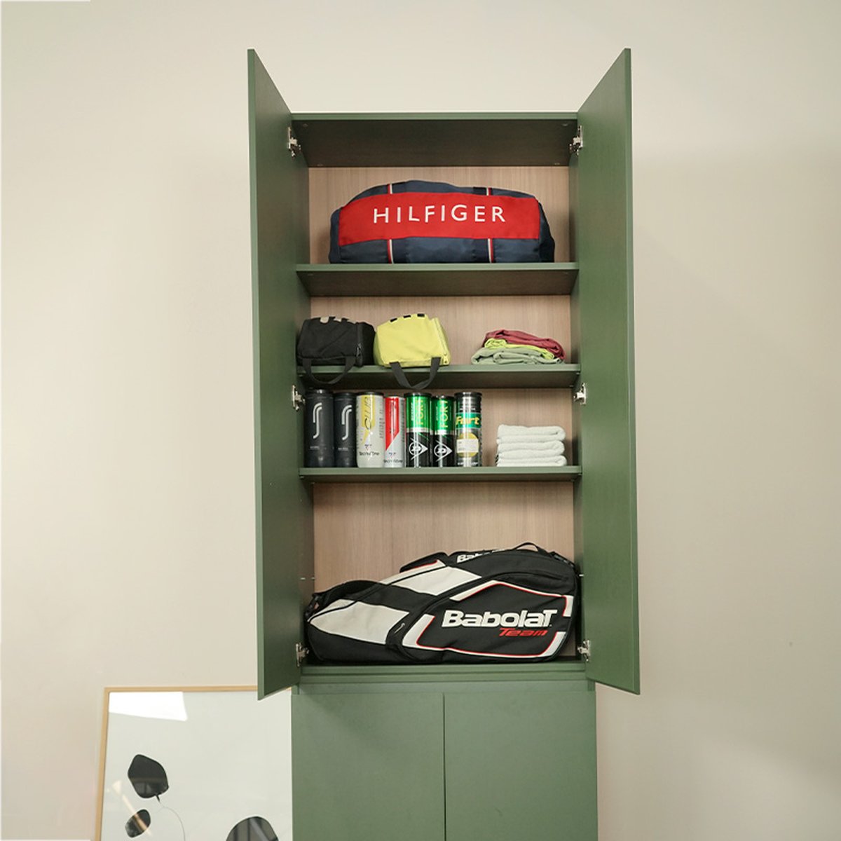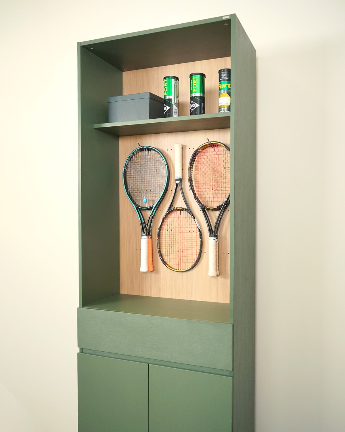 ฿ 22,000เก็บไม้เทนนิส ไม้แบดมินตัน ไม้พาเดล เหรียญรางวัล หมวก หรือของต่างๆมีชั้นวางของ pegboard สำหรับแขวนของ ตู้เก็บของไม้เคลือบเมลามีน ทำความสะอาดง่าย ทนรอยขีดข่วน, ความร้อน,ไอน้ำเกรด E1 ปลอดภัยต่อผู้ใช้งาน