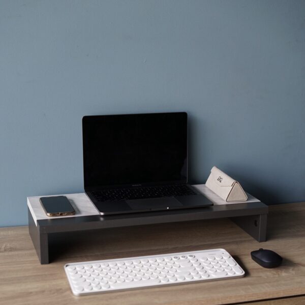 ชั้นวางจอคอม ทำจากไม้ปาร์ติเกิ้ลบอร์ดหนา 15 มม. ติดผิวเมลามีนทั้งตัว มีช่องด้านหน้าสำหรับตั้งโทรศัพท์มือถือ และมีช่องเก็บของที่มีฝาปิดด้านหลัง ดีไซน์มาเพื่อสุขภาพ ปรับให้จอคอมอยู่ในระดับสายตา ช่วยลดการเป็นออฟฟิศซินโดรม และยังสามารถเป็นที่จัดเก็บคีย์บอร์ด และอุปกรณ์เครื่องใช้ในออฟฟิศต่างๆ ทำให้โต๊ะทำงานดูสะอาดสะอ้านและเป็นระเบียบ แข็งแรง รับน้ำหนักได้ 12 กิโลกรัม
