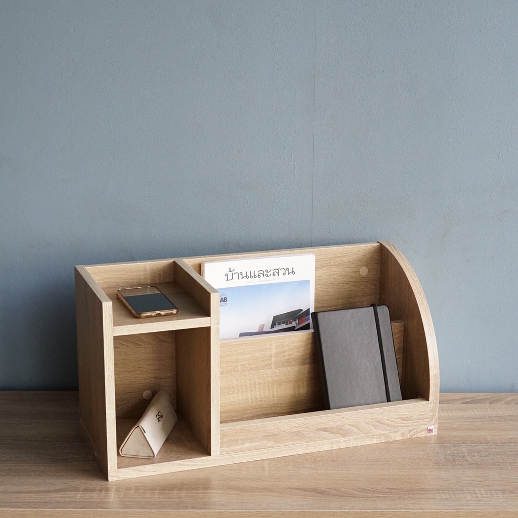 ผลิตจากไม้ปาร์ติเกิ้ลบอร์ด หนา 15 และ 18 มม. ชั้นวางของใช้บนโต๊ะทำงาน สมุด หนังสือ เครื่องเขียน (เป็นสินค้าน็อคดาวน์ ลูกค้าประกอบเองได้ง่ายๆ มีแบบประกอบให้ในกล่อง) สามารถปรับระดับชั้นลอยได้ 3 ระดับตามภาพประกอบ