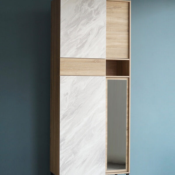 ชั้นวางรองเท้าพร้อมกระจกทรงสูง สีโซลิดโอ๊ค-หินอ่อน รุ่น SB-8343-S-MB จาก Inhome Furniture เป็น ชั้นวางรองเท้า ที่เหมาะสำหรับคอนโดเป็นพิเศษ เนื่องจากมีขนาดไม่กว้างนัก เพียง 83 ซม. แต่สูงถึง 209 ซม. ทำให้ประหยัดพื้นที่ และสามารถจุรองเท้าได้มากถึง 43-47 คู่ หรือเก็บของอื่นๆ ได้มากเช่นกัน มีบานเปิด soft-close 4 บาน มีขาเหล็กสีดำ สามารถวางรองเท้าไว้ด้านล่างเพิ่มได้อีก 2-3 คู่ มีกระจกเพื่อส่องเช็คความเรียบร้อยก่อนออกจากบ้าน ชั้นวางรองเท้า และภายในทำจากไม้ ปาร์ติเกิ้ลบอร์ด ปิดผิวด้วย เมลามีน ทั้งตัว ทำให้มีความทนทานต่อรอยขีดข่วน และน้ำ (Water Resistant) ทำให้มีความทนทานต่อรอยขีดข่วน และน้ำ (Water Resistant) ปิดผิว สีโซลิดโอ๊ค และหน้าบาน สีหินอ่อน เข้ากับบ้านหรือคอนโด สไตล์ luxury เรียบหรู ได้ดี เป็น เฟอร์นิเจอร์ น็อคดาวน์ สามารถถอดประกอบได้
